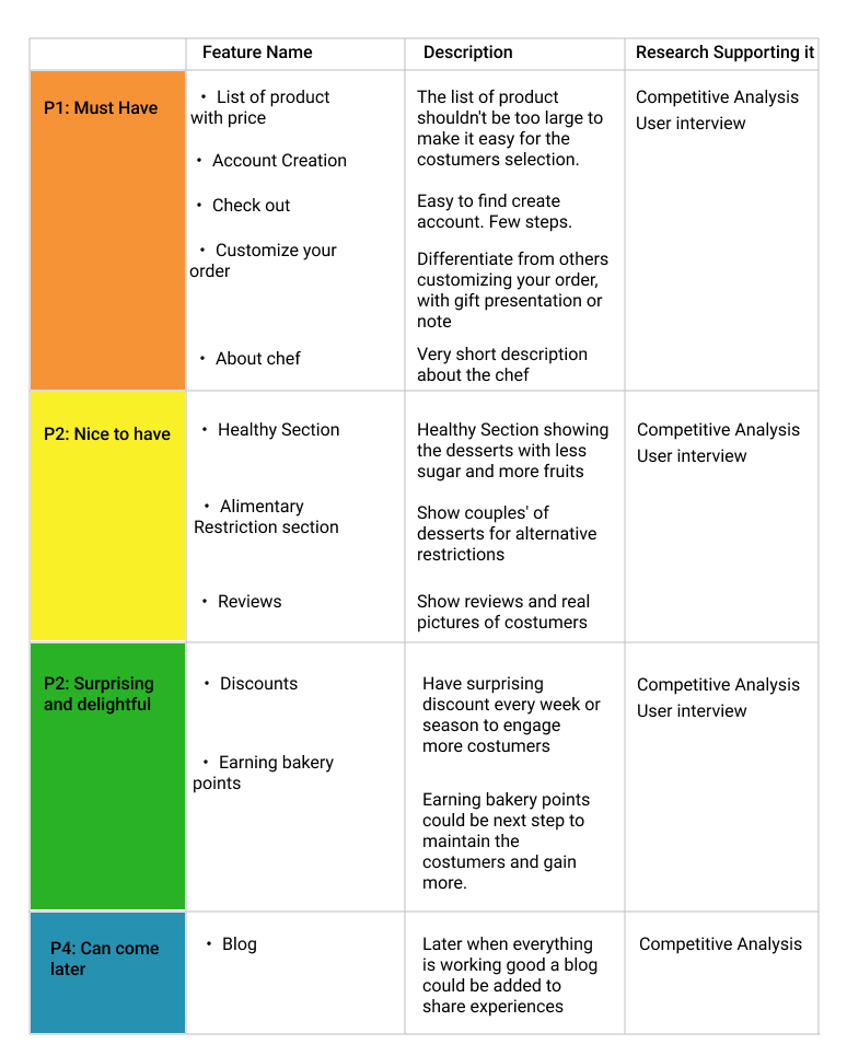 Based on recent research, I prioritized product features and organized them into four categories. I placed special emphasis on 'must-have' features due to time constraints.