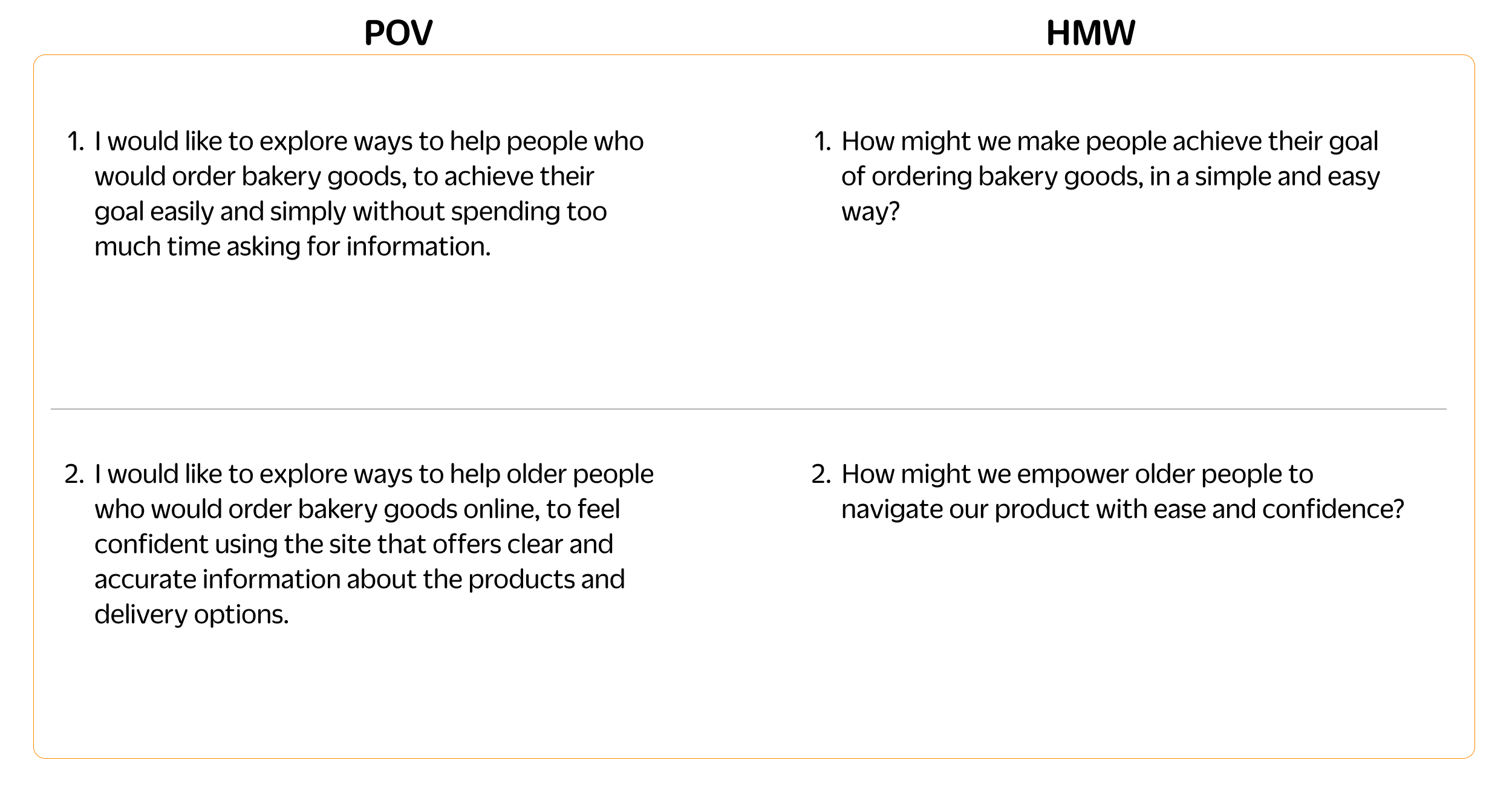 After gathering all the research about the experience of ordering a bakery product online, the data was synthesized and the problem defined, which helped me to develop the point of view (POV) and how might we (HMW) questions.